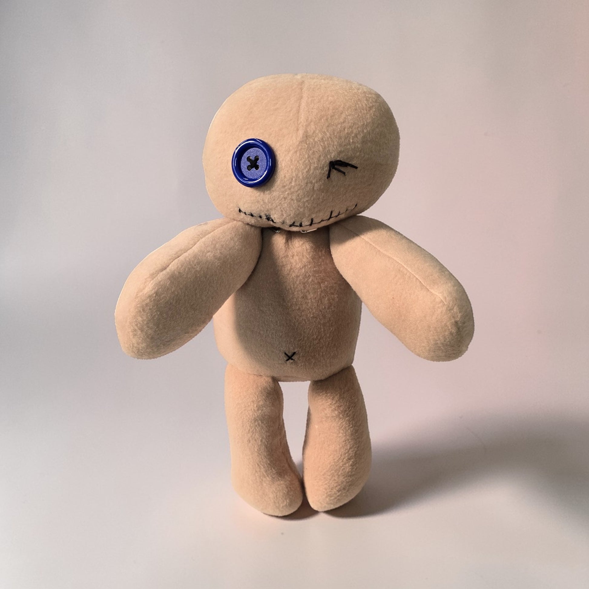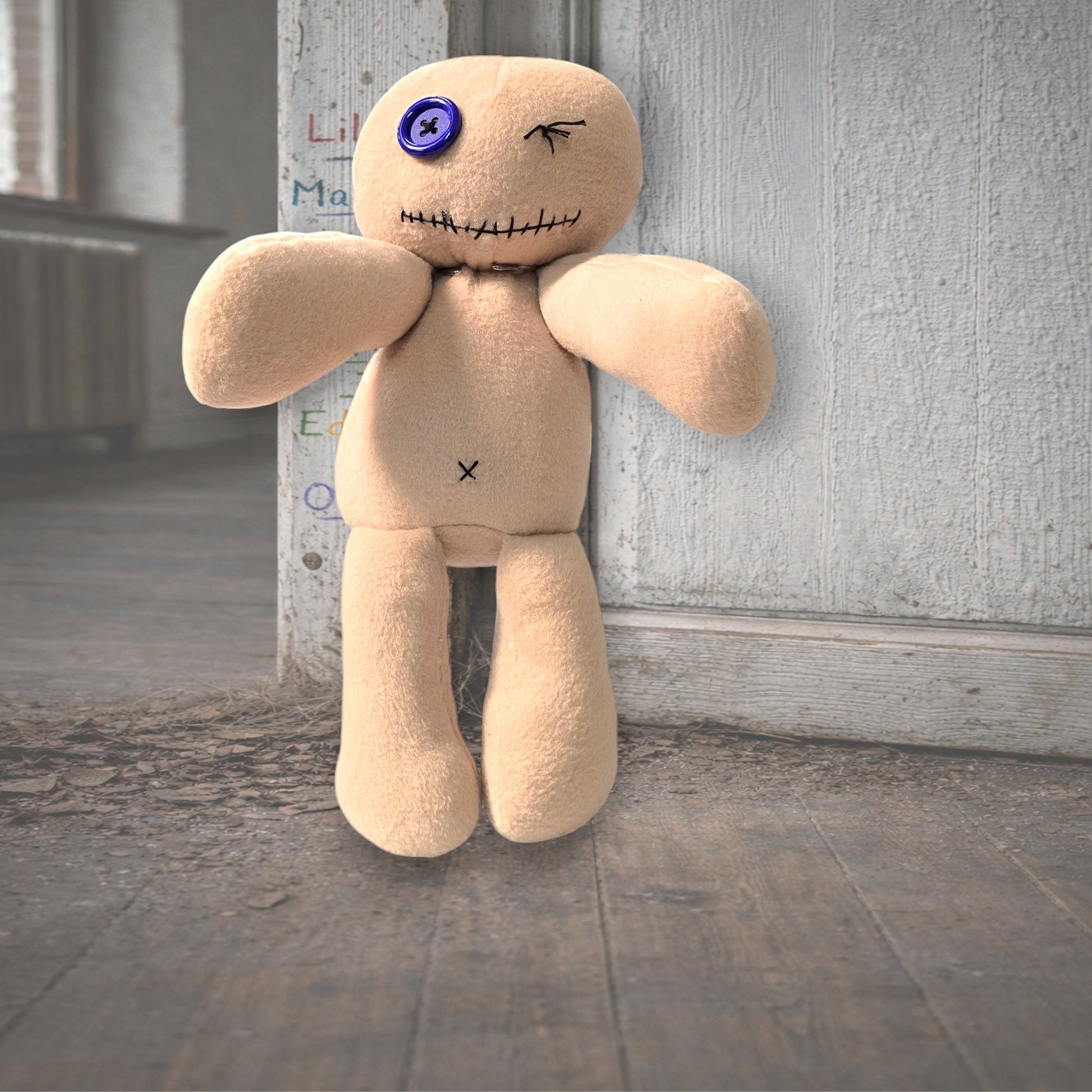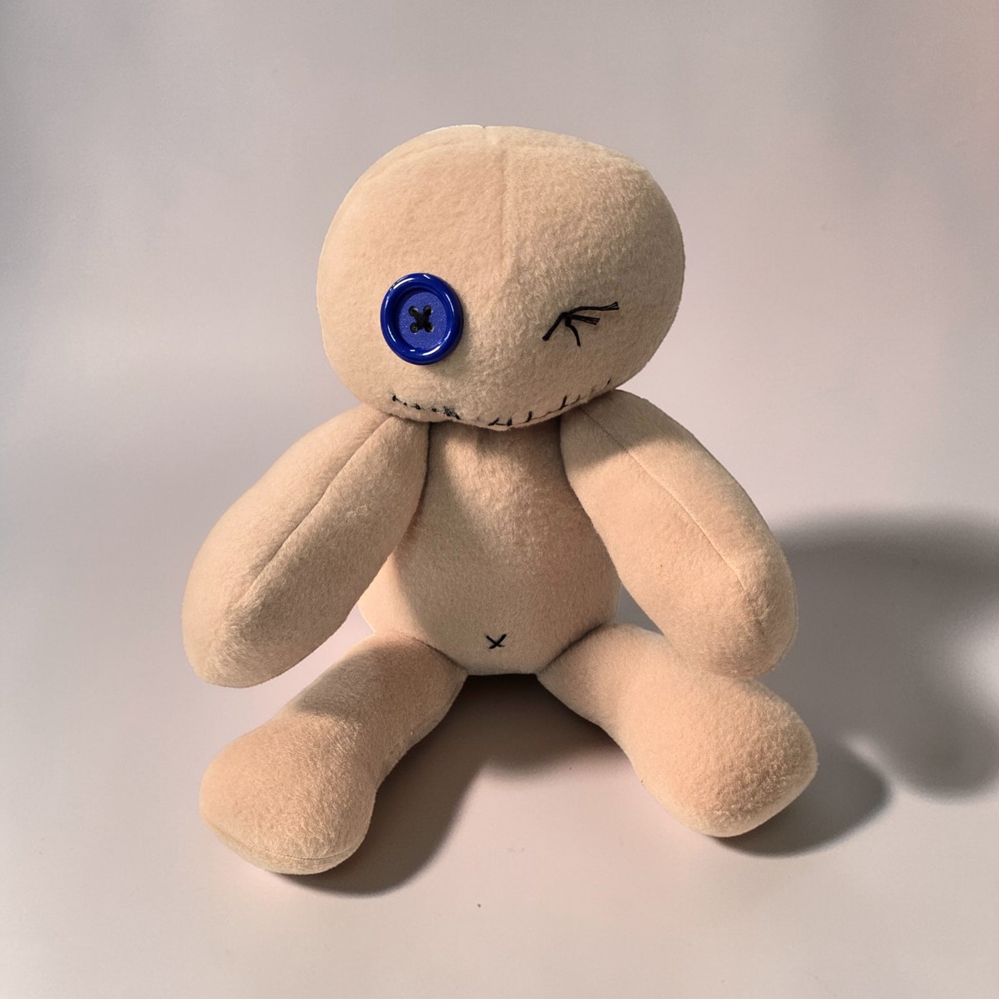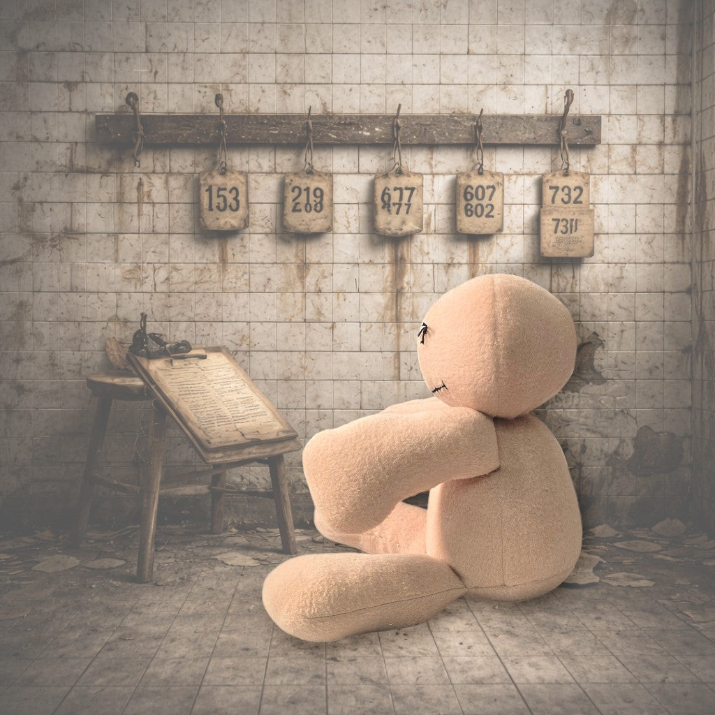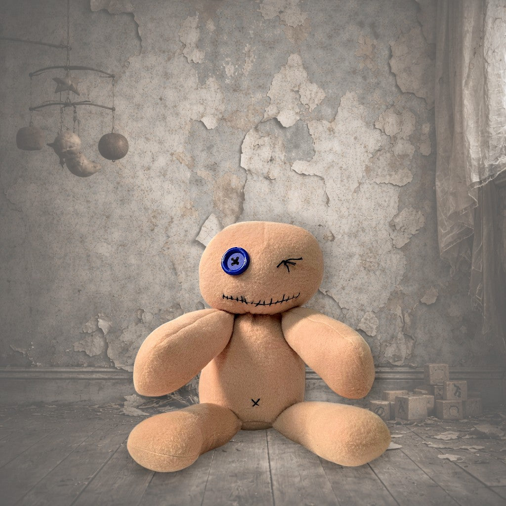 One eye open — a single blue button, bright and watchful. One eye stitched firmly shut, as if he'd seen something at some point and quietly decided he'd seen quite enough of it, thank you. His mouth is stitched too, pulled into a line that the day nurse insists is the beginning of a smirk and the night nurse insists is something else entirely.