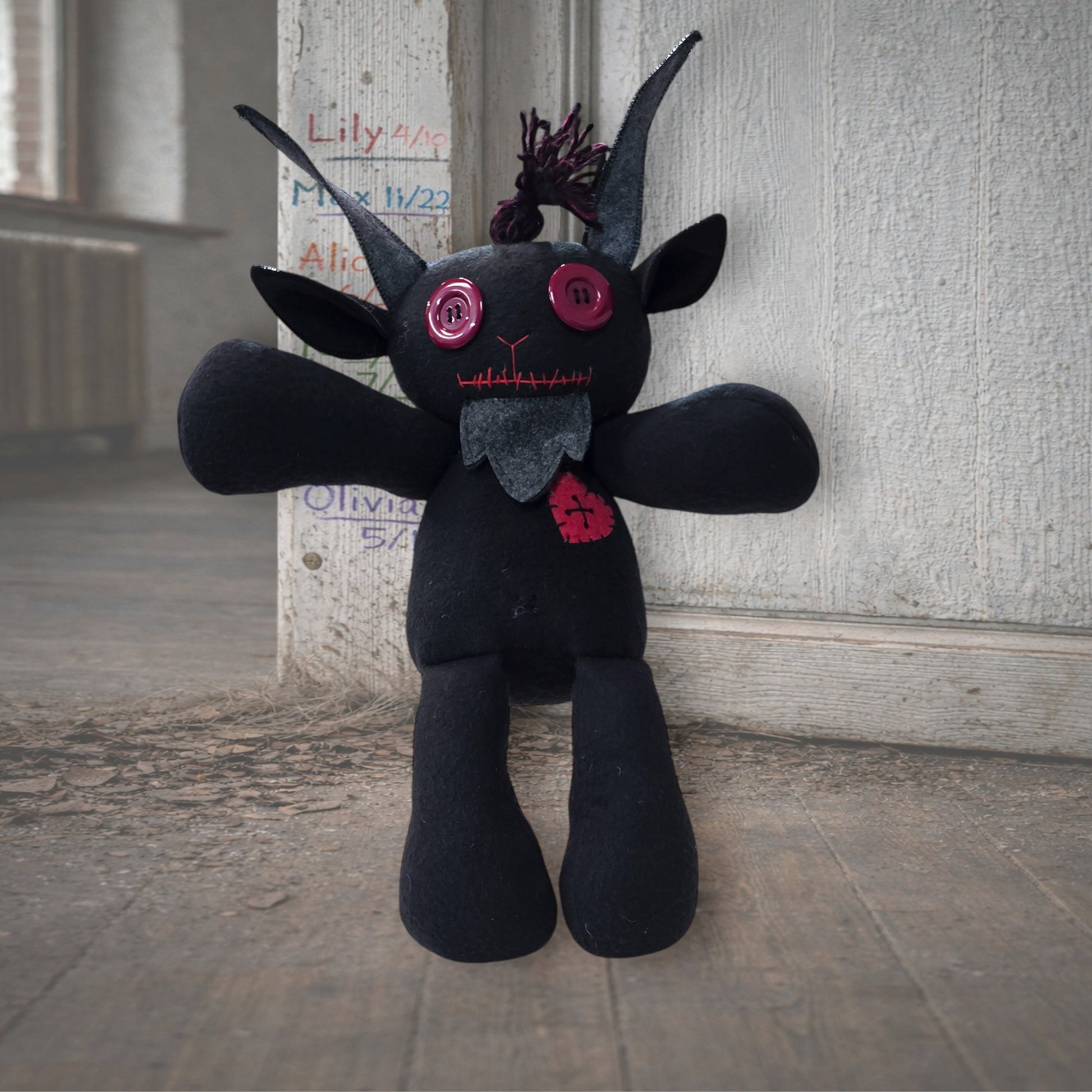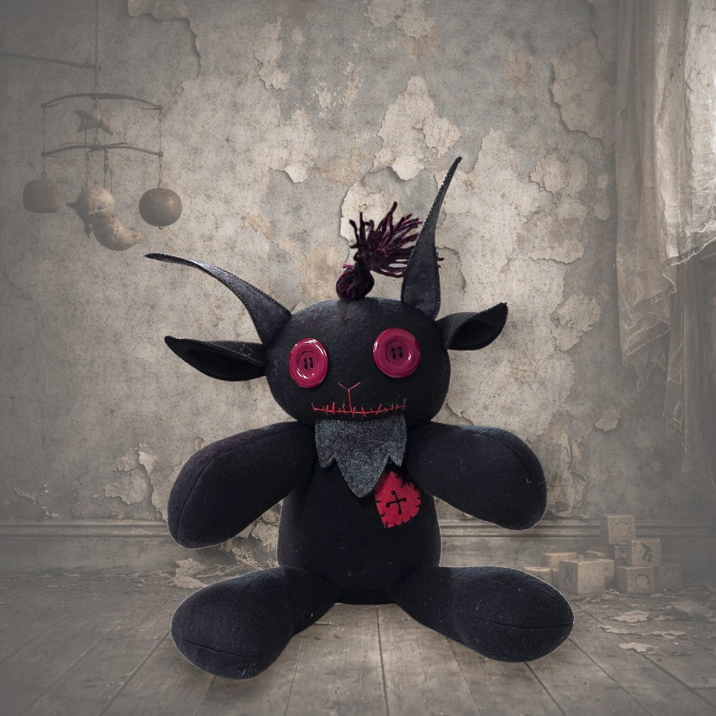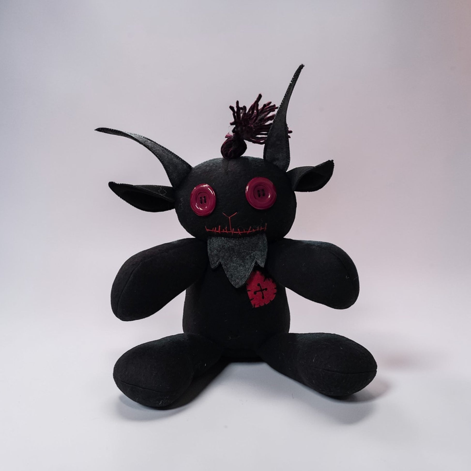 He has horns — two sharp ones flanking a magnificent dark mohawk that lists slightly to one side in a way that implies either great confidence or complete indifference to what you think about it. His eyes are deep crimson buttons, the color of old wine and bad decisions, and they hold your gaze just long enough to make you feel like you've agreed to something.